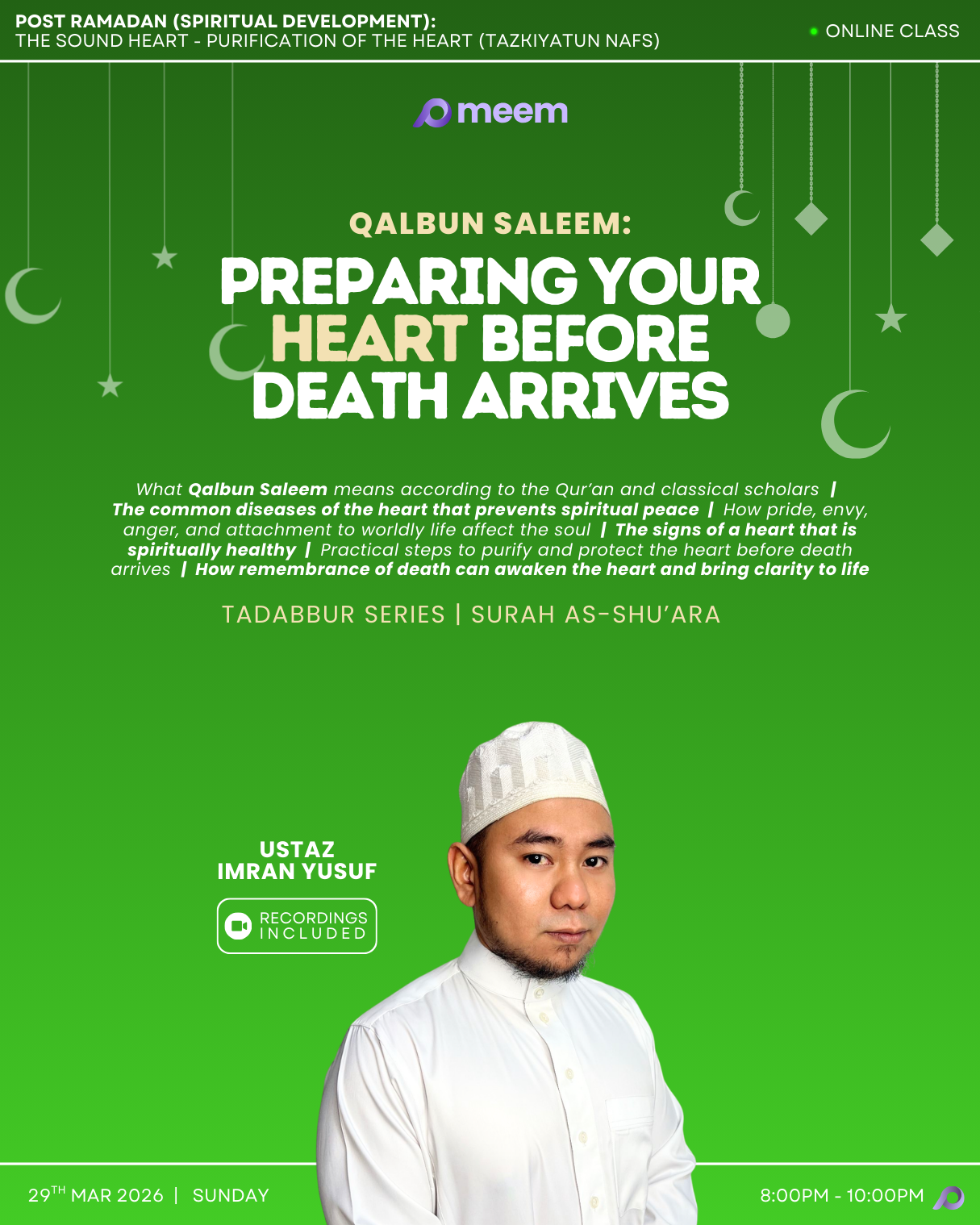 Every one of us knows that death will come. Yet many of us live as though it is distant, forgetting that what truly matters at the end of our lives is not our wealth, status, or achievements, but the state of our hearts. Allah reminds us in the Qur’an: يَوْمَ لَا يَنفَعُ مَالٌ وَلَا بَنُونَ إِلَّا مَنْ أَتَى اللَّهَ بِقَلْبٍ سَلِيمٍ “On the Day when neither wealth nor children will benefit, except the one who comes to Allah with a sound heart.” (Surah Ash-Shu‘ara 26:88–89) In this reflective and deeply important session, Ustaz Imran Yusof will guide participants through the meaning of qalbun saleem, the sound and pure heart that Allah describes in the Qur'an. Participants will explore the spiritual diseases that quietly affect the heart, such as pride, envy, resentment, and attachment to the dunya, and learn practical steps to cleanse and protect the heart before the inevitable moment when we return to Allah. This class invites you to pause, reflect, and begin the process of preparing your heart for the meeting with your Lord.