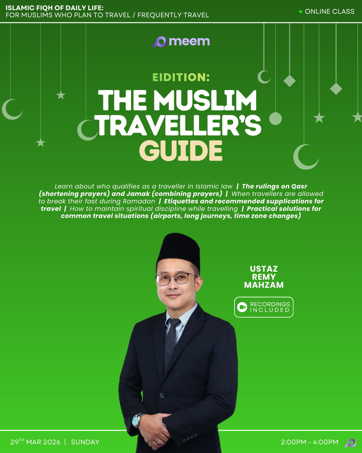 Travelling is one of the most common parts of modern life. We travel for work, holidays, family commitments, and sometimes even for spiritual journeys. Yet many Muslims remain unsure about how to properly observe their religious obligations while on the move. In this practical and informative session, Ustaz Remy Mahzam will guide participants through the essential rulings and spiritual etiquette of travelling in Islam. From shortening and combining prayers to understanding when one qualifies as a traveller in Islamic law, this class will help Muslims travel with clarity, confidence, and peace of mind. Participants will also explore the deeper spiritual dimension of travel in Islam, learning how journeys can become opportunities for reflection, gratitude, and closeness to Allah. Whether you travel frequently or only occasionally, this class will equip you with the knowledge needed to practise your faith correctly wherever you go.