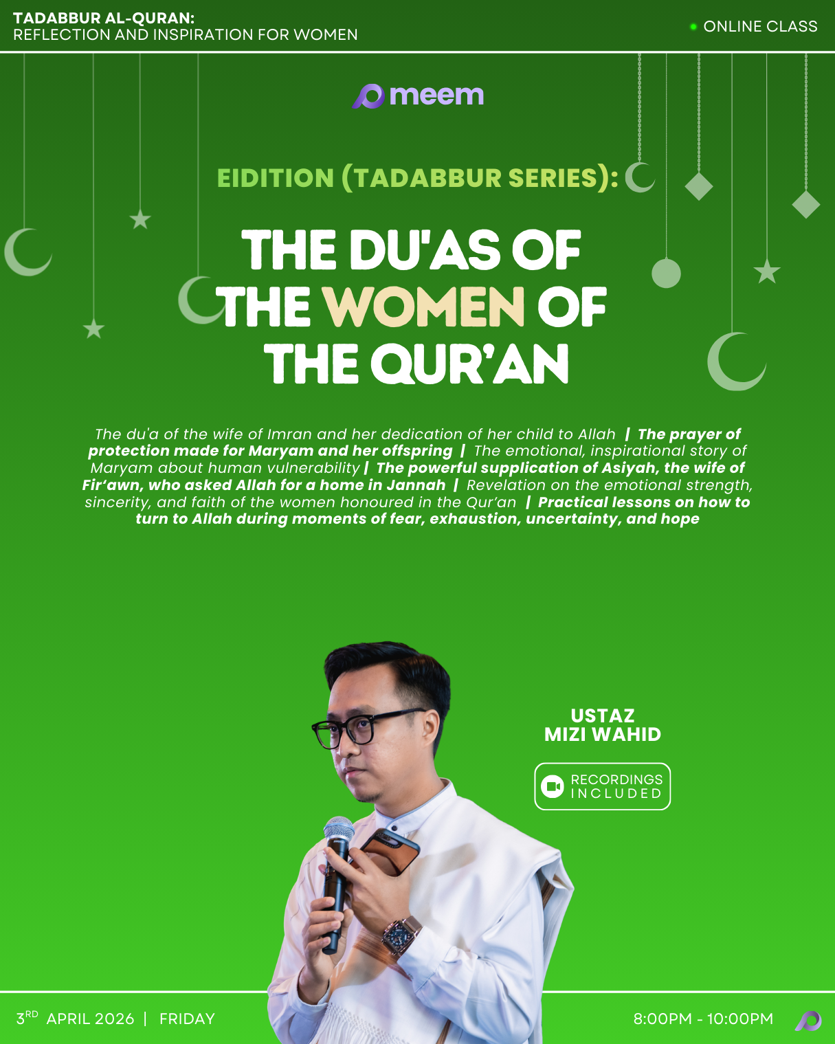 The Qur'an preserves powerful moments where women turned to Allah in sincerity, vulnerability, and faith. In times of fear, uncertainty, hardship, and hope, their hearts found refuge in du'a. Their words and experiences were not lost to history. Allah honoured them by recording their stories in the Qur'an as guidance for believers until the end of time. In this reflective tadabbur session, we will explore several of the du'as and heartfelt moments connected to the women mentioned in the Qur'an. From the mother who prayed for her unborn child, to the woman who sought refuge from oppression, to the cries of a heart overwhelmed by pain, these moments reveal the depth of faith, patience, and reliance upon Allah. Through these verses, participants will discover how the struggles and emotions of women across time echo many of the challenges faced today. This session invites participants to reflect on these powerful stories, understand their deeper meanings, and learn how to turn their own hearts towards Allah with sincerity and trust.